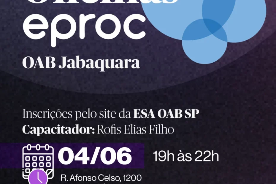 A capacitação que vai te preparar para dominar o sistema eproc já tem data marcada!🗓 Data: 04 de junho🕒 Horário: das 19h às 22h📍 Local:… Continue a ler »Oficinas eproc na OAB Jabaquara!