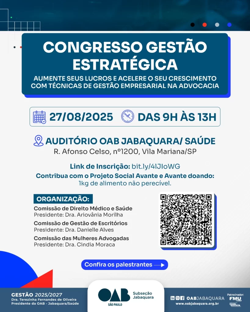 📍 Local: Auditório da OAB Jabaquara/Saúde – Rua Afonso Celso, nº 1200, Vila Mariana/SP