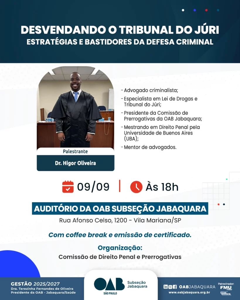A Comissão de Direito Penal e Prerrogativas da OAB Subseção Jabaquara convida para a palestra “Desvendando o Tribunal do Júri: estratégias e bastidores da defesa criminal”, com o palestrante Dr. Higor Oliveira.