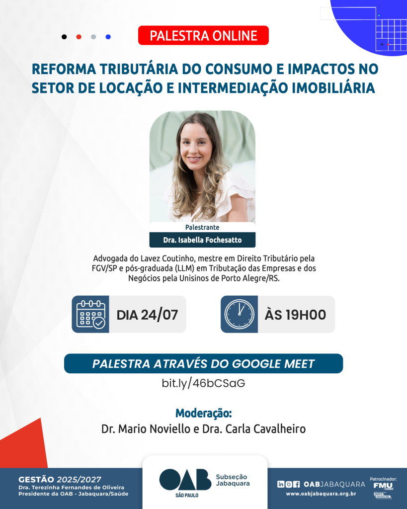 No dia 24/07, às 19h, participe da palestra com a Dra. Isabella Fochesatto, que irá abordar os impactos da Reforma Tributária do Consumo no setor de locação e intermediação imobiliária.